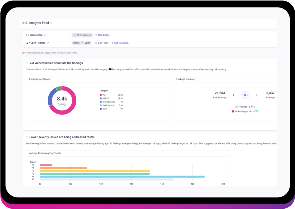 The Insights Agent eliminates that manual lift. Instead of digging through scanner dashboards, teams get clear, contextual answers at the click of a button.