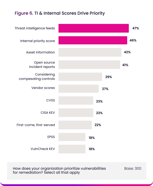 Despite the outsized impact prioritization has on the success of vulnerability remediation, most organizations continue to rely on approaches that fall short. The report reveals that the most commonly used methods are threat intelligence feeds (47%) and internal priority scores (46%). These approaches certainly have value, especially when tailored to an organization’s specific environment, but they’re loosely structured and disconnected from broader risk signals.