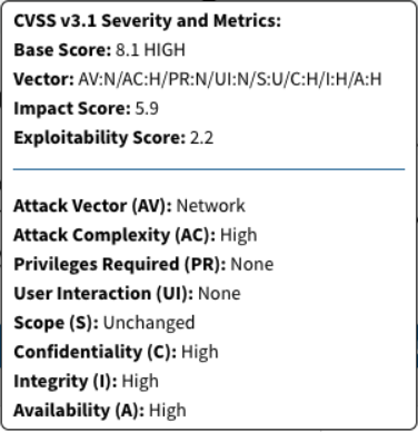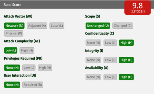 The Attack Vector, Privileges Required, and User Interaction metrics also received the most severe scores (Network, None, None, respectively). Again, this aligns with the nature of the vulnerability—it is a remote, unauthenticated RCE requiring no user interaction.