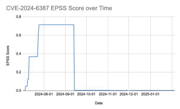 EPSS scores are calculated automatically on a daily basis. Let’s review the EPSS score of CVE-2024-6387 from its discovery until early February, 2025: