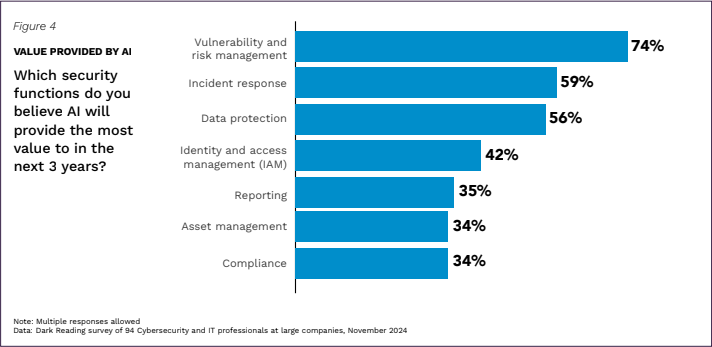 The report shows that 74% of security professionals believe AI will provide the most value in vulnerability and risk management over the next three years—more than any other area of cybersecurity.
